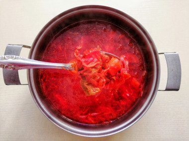 7. Когда капуста будет готова введите подготовленную свекольную заправку. Доведите до кипения, отрегулируйте сахаром при необходимости кислоту, добавьте соль, лавровый лист. Подержите под крышкой минут 10, чтобы борщ настоялся.