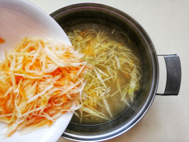 Капуста у меня была домашняя, не очень кислая. Поэтому я ее не промывала, поместила в кастрюлю вместе с небольшим количеством рассола. Сделала это, когда варившаяся в бульоне картошка была уже  почти готова.