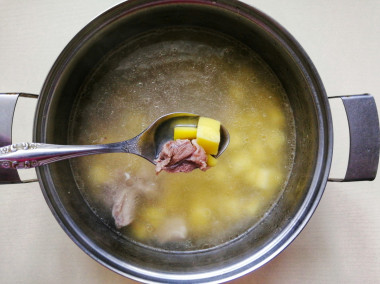 Бульон сделала на свиной косточке. Мяса на ней было достаточно много. Срезала его, когда мясо сварилось, и вернула в бульон, а кость удалила.