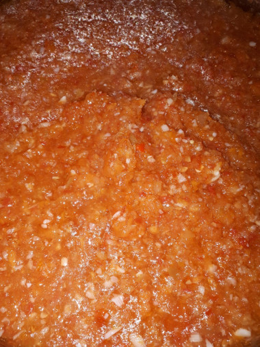 Спасибо за рецепт Аджика помидоры, перец, яблоки!!! Очень вкусно! Такую же аджику готовила моя бабушка в детстве. Вкус остро-кисло-сладкий, запах чеснока с томатом просто чудесный. Сахара больше добавила, чем в рецепте, но это дело вкуса. Яблоки взяла Гренни, вместо Антоновки. И после добавления соли и сахара .... еще варила минут 20 , помешивая. Рекомендую рецепт. Смачного