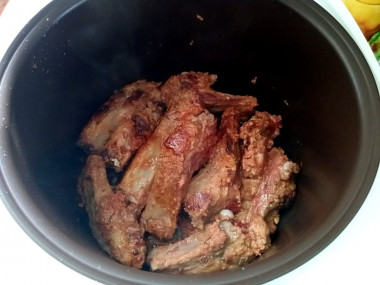В чашу мультиварки налейте растительное масло и включите режим "Жарка". Выложите подготовленные свиные ребра и обжарьте их до появления румяности. Затем посыпьте солью и специями. Можно взять молотый черный перец и хмели-сунели. По желанию специи можете взять любые на свой вкус.