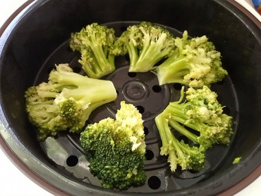 На специальную подставку для приготовления на пару выложите соцветия капусты на расстоянии друг от друга, чтобы вся капуста равномерно приготовилась. Не солите капусту: соль выводит влагу и капуста получится не очень сочной. Поставьте подставку на чашу мультиварки, а саму чашу в прибор. Включите режим "На пару". Как правило, стандартное время готовки в режиме "На пару" около 20 минут.