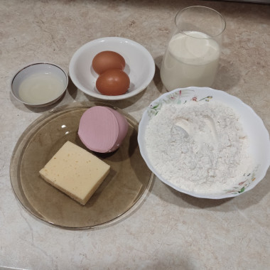 Как сделать блины с колбасой и сыром? Подготовьте все необходимые ингредиенты. Молоко, вода и яйца должны быть комнатной температуры, чтобы тесто получилось удачным. Поэтому достаньте их из холодильника заранее — за 1-2 часа.