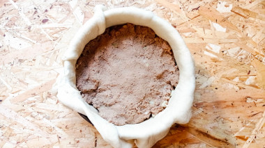 Форму для выпечки смазываем маслом, раскатываем тесто и размещаем его в форме, края должны быть выше борта формы. Лучше всего подойдёт небольшая форма, до 22 см в диаметре. Наполняем пирог подготовленной начинкой и приподняв тесто, собираем его и закрываем пирог. Оставляем его в теплом месте на 25 - 30 минут, после чего смазываем яичным желтком и отправляем в духовку разогретую до 180 градусов, выпекаем в течение 25 минут до красивой румяной корочки.