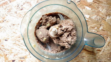 Для начинки взяла 400 граммов печени и четыре картофелины среднего размера. Отваренные печень и картофель измельчила в кухонном комбайне.