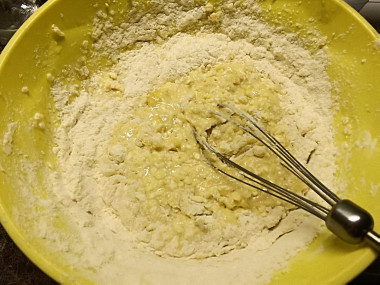 По одному введите в тесто яйца, хорошо вымешивая массу после каждого венчиком.