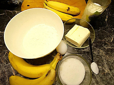Как сделать банановый кекс в духовке? Подготовьте продукты. Чтобы кекс получился мягким и пышным, они должны быть комнатной температуры, поэтому яйца, молоко и масло выньте из холодильника заранее. Бананы для выпечки лучше возьмите чуть переспелые, тогда кекс получится более ароматным. К тому же такие бананы очень сладкие, можно будет уменьшить количество сахара.