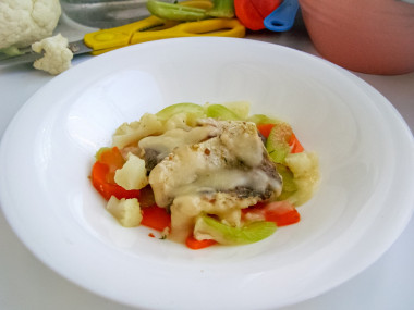 При подаче выложите на тарелку овощи, а на них кусочки рыбы. Полейте их соусом. Подавайте к столу. Приятного аппетита!