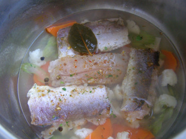 Для припускания рыбы подойдет сковорода с высокими бортами, сотейник или кастрюля. Налейте в нее немного воды, положите лаврушку и перец горошком. Доведите до кипения. Выложите морковь и сельдерей, потомите пару минут на небольшом огне при слабом кипении.