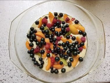 Форму для запекания диаметром 18-20 см застелите пергаментом и смажьте сливочным маслом. Вылейте на дно большую часть теста. Поверх распределите фрукты и ягоды. Можете укладывать фрукты не в один слой, а еще в миске вмешать их в тесто и переложить все вместе в форму.
