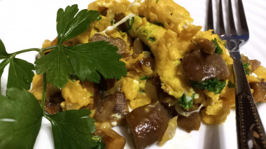 Грибы почистила, отварила, охладила. Затем порезала на кубики. Очищенный, репчатый лук нарезала полукольцами. В миске взбила яйца, добавила свежую зелень.