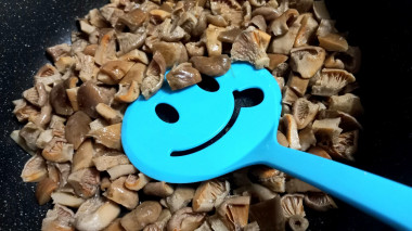 2. Лук очищаем, нарезаем тонкими полукольцами, обжариваем на оставшемся растительном масле, жарим до мягкости, после чего соединяем с грибами, солим и перчим по вкусу.