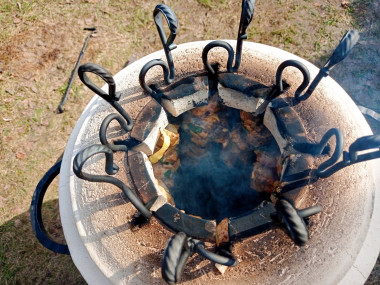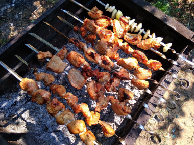 Разожгите мангал. Подождите пока прогорят дрова или угли. В это время нанижите мясо на шампуры. Лук и зелень оставьте в кастрюле, свои ароматы и соки они уже отдали кусочкам мяса.