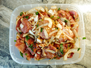 Приезжая на дачу, всегда хочется приготовить что-нибудь на свежем воздухе. В этот раз я решила замариновать шашлык из свинины с луком. Мяса у меня было 2 кг. На это количество мяса я взяла две крупные луковицы, средний пучок кинзы, добавила пару щепоток соли и по полной столовой ложке черного молотого перца и паприки. Мариновалась свинина около 15 часов.