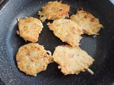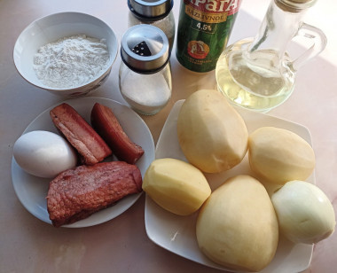 Как сделать брамбораки по-чешски? Подготовьте все необходимые ингредиенты. Если в наличии не оказалось бекона, то можно использовать свиную вырезку, либо грудинку. Картофель очистите от кожуры и помойте.