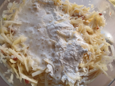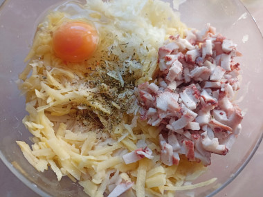 Очищенный картофель натрите на крупной терке. Отожмите лишнюю жидкость, добавьте сырое яйцо и хорошо размешайте.