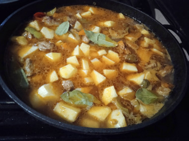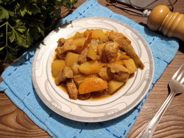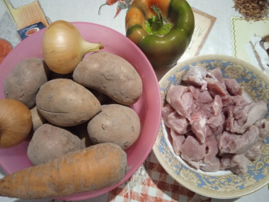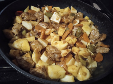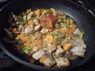 Каурдак - какое интересное название. Захотелось и мне приготовить восточное жаркое, имея все продукты под рукой. Единственное, я заменила помидоры на томатную пасту. Вместо говядины взяла привычную нам свинину. Вымыла, почистила и нарезала все продукты по описанию в рецепте. Болгарский перец использовала замороженный. Сначала обжарила мясо. Потом добавила лук с морковью. Затем сладкий перец и картошку. Готовила четко по инструкции в рецепте. Долила воды, положила специи и томатную пасту. От себя ещё положила лавровые листики. Тушила под крышкой 25 минут. Очень простое приготовление сытного блюда. Жаркое и вправду похоже на привычное нам русское блюдо с мясом и картошкой. Потрясающе вкусно вышло, ароматно и очень аппетитно. Все ингредиенты идеально дополняют друг друга и получается просто сказочно вкусно. Замечательный рецепт! Большое спасибо автору 😊