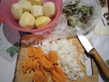 Лук и морковь чистим и крупно нарезаем, морковь-кружочками, лук-полукольцами.