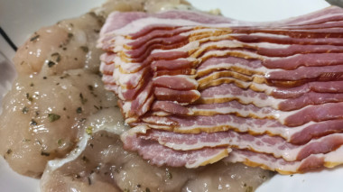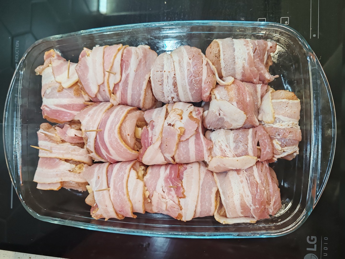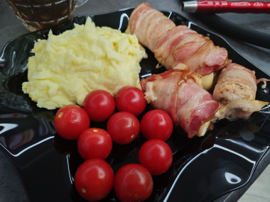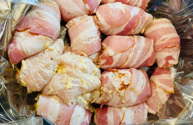 Куриные рулетики в беконе получились плотные и я решила не использовать зубочистки для скрепления.