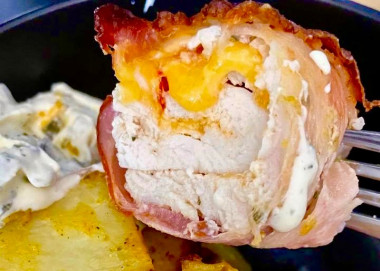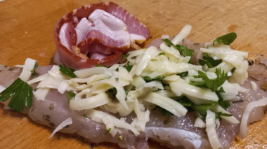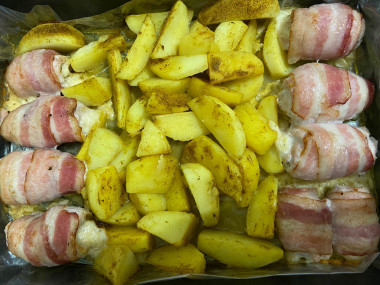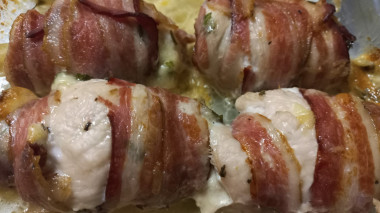 Обмотайте каждый куриный рулетик тонким ломтиком бекона. Можете для надежности скрепить их зубочисткой, чтобы в процессе дальнейшего приготовления они не развернулись.