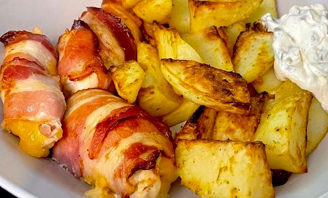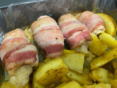 Во время приготовления, куриные рулетики в беконе в духовке, выделили много сока и получились очень сочные, нежные с лёгким, ненавязчивым вкусом копчёности от бекона.