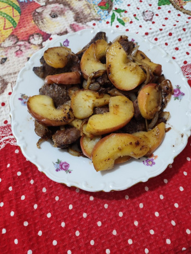 Яблоки обжаривала недолго,чтобы сохранили форму. Затем добавила печень,аккуратно перемешала и протушила всё вместе буквально несколько минут.