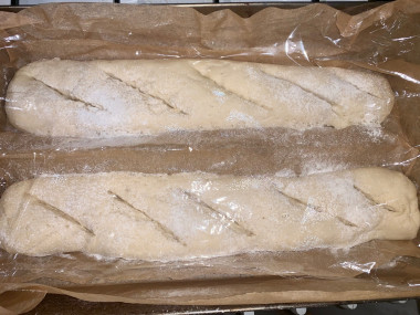 Переложите багет на застеленный пергаментом противень и оставьте в теплом месте для расстойки на 1 час 30 минут.