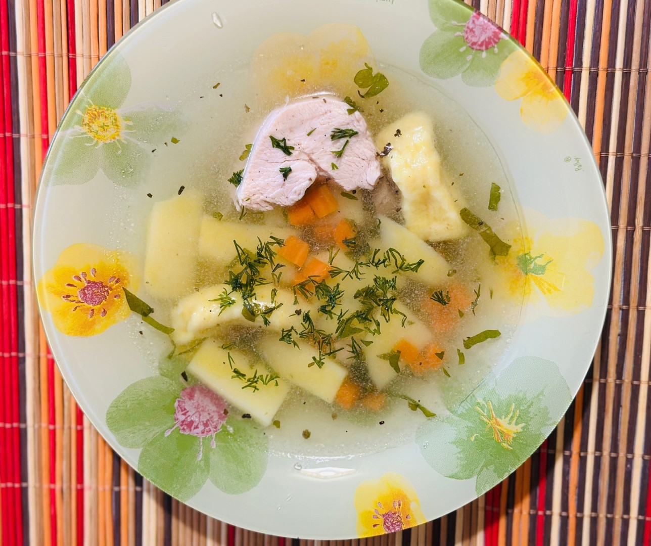 Куриный суп с галушками получился просто потрясающий! Он и сытный, и очень вкусный, и ароматный! Яркие галушки с куркумой - просто чудо! Вся семья в восторге, спасибо автору за рецепт!