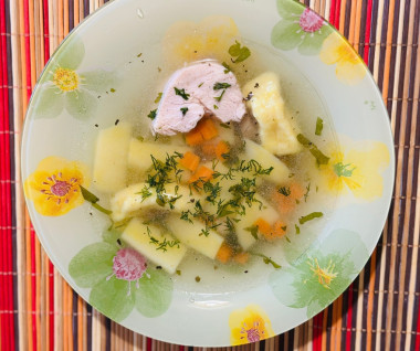 Люблю легкие в приготовлении блюда. Поэтому куриный суп с галушками для меня удачный выбор! Бульон я сварила из грудки и голени фермерской курицы. Бульон получился наваристый и красивый (согласитесь, это немаловажно). Следовала четко рецепту. Впервые в тесто добавила куркуму. Действительно, галушки очень аппетитно смотрелись. А приправа придала некую остринку и изюминку. Так, что, хозяюшки, берите рецепт на вооружении и побалуйте своих домочадцев! Мои остались довольны.