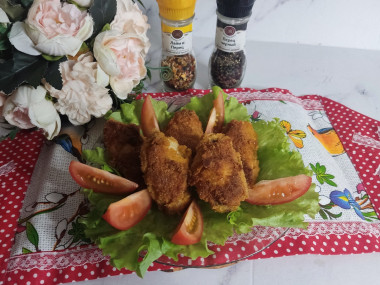 Крылья обмакнула в яйца,затем в сухари панировочные и обжарила на сковороде до готовности.