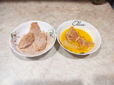 В отдельной чаше взболтайте яйца, а в тарелку насыпьте панировочные сухари с солью, перцем и паприкой. Перемешайте.