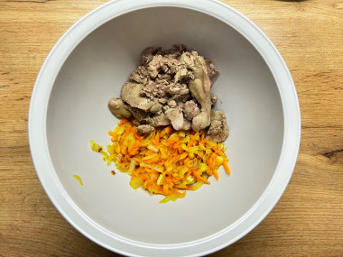 Подготовьте продукты для начинки. Печень лучше берите охлажденную, незамороженную — она получится сочнее. Специи добавляйте по своему вкусу. Масло возьмите рафинированное, без запаха.