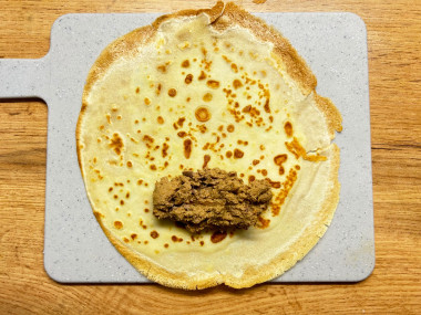 Нафаршируйте блины печенкой — положите ложку начинки на край блина, заверните ее с двух сторон, а затем скрутите рулетом. Готовые блины вы можете разогреть на сковороде.