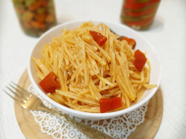 Из обычного картофеля получилась вкусная картошка по-корейски. Список ингредиентов и способ приготовления по рецепту автора, из специй дополнительно добавила сладкую паприку, острый красный и черный молотые перцы. Основной компонент, конечно же кориандр. Главное, специи и чеснок облить горячим подсолнечным маслом, и аромат специй заполнит весь дом.