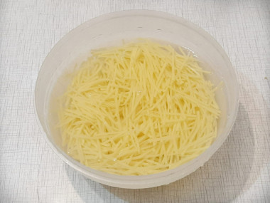 Затем натрите клубни на терке для корейской моркови, погружая измельченный картофель сразу в большой объем воды. Когда вся картошка будет натерта, промойте тонкие "ниточки" в 2-3 водах. Этим вы вымоете крахмал из картошки и она не развалится при варке.
