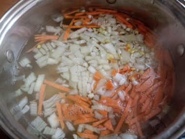 Разогрейте на сковороде растительной масло и обжарьте на нем лук с морковью, помешивая, до мягкости. В кастрюлю налейте воду, поставьте её на сильный огонь и доведите до кипения. При желании можно не делать зажарку, а положить морковь с луком сразу в суп в шаге 6. С выбором идеальной кастрюли поможет статья о кастрюлях, ссылка в конце рецепта.
