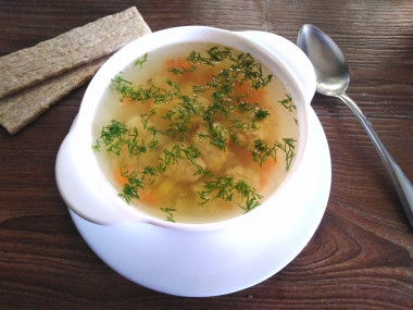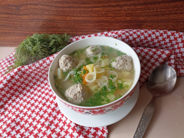 К обеду приготовила суп с мясными фрикадельками. Фарш у меня был свиной, добавила к нему яйцо, соль и перец, сформировала фрикадельки. Поставила варить нарезанные овощи, когда они дошли до кипения опустила в бульон фрикадельки. Всё вместе варила примерно 20-30 минут, вместо вермишели добавила в суп макароны-бабочки. После этого суп варила ещё примерно 5 минут ( побоялась , что макароны переварятся). В готовый суп добавила свежую зелень. Получилось очень вкусно, сытно, ароматно. Обычно я в супы добавляю обжаренные лук и морковь, но вариант без зажарки мне тоже понравился. Спасибо за рецепт, Snezhana!