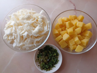 Отправьте картофель и капусту в кипящую воду. Добавьте соль, пряности по вкусу (лавровый лист, душистый горошек, сушеный укроп) и варите после закипания около 20-25 минут на малом огне.