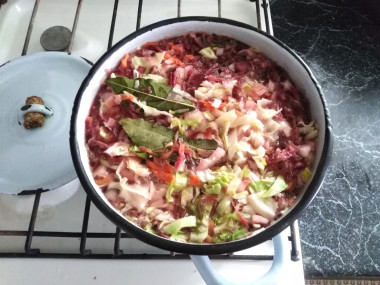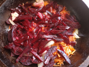 Затем добавьте свеклу. Уменьшите огонь, накройте сковороду крышкой и готовьте овощи до размягчения свеклы. В конце добавьте немного уксуса, чтобы сохранить яркий цвет свеклы. При желании можно добавить в зажарку при тушении еще сладкий болгарский перец и немного томата в виде пасты, сока или свежих илизамороженных помидоров. В кастрюле вскипятите воду. С выбором кастрюли для супа поможет статья по ссылке в конце рецепта.