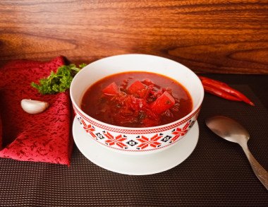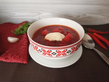 К обеду приготовила овощной борщ. Непривычным для меня было отсутствие в рецепте томата или помидор, интересно было попробовать и такой вариант. Вместо столового уксуса использовала яблочный. Хотелось чтобы борщ был с выраженной кислинкой, поэтому попробовав зажарку, я увеличила количество уксуса по своему вкусу. Зелень использовала замороженную ( укроп, петрушку и сельдерей). Готовый борщ мне понравился, получился он красивого рубинового цвета, ароматный. Если свекла не очень сладкая, можно дополнительно добавить немного сахара, для полноты вкуса. Подавать борщ можно со сметаной или майонезом.Спасибо автору за рецепт!