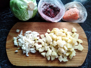 Как сварить овощной борщ? Подготовьте все необходимые ингредиенты. Сначала приготовьте зажарку. Для этого очистите лук, свёклу и морковь и обмойте.
