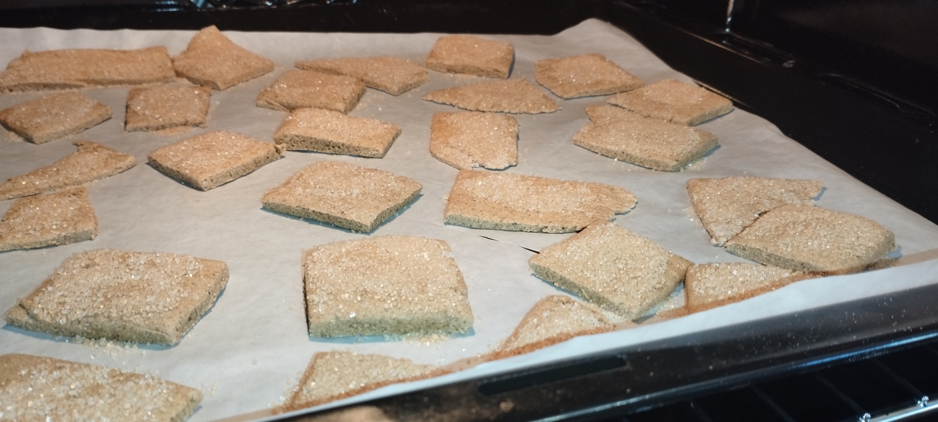Ориентируйтесь на свою духовку и желательно постоянно следите, чтобы печенья не подгорели. Я раскатала тесто слишком тонко, отвлеклась на 1 минуту на звонок и в центре пара печений подгорели. Поэтому либо сразу включайте конвекцию, чтобы воздух равномерно распределялся по всему периметру противня либо не отходите далеко от духовки, чтобы не пропустить момент готовности.