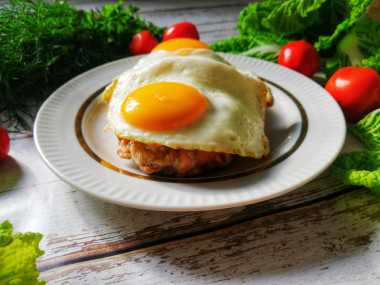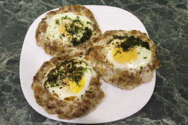 Отдельно пожарьте яичницу-глазунью и уложите красиво на каждый бифштекс. Приятного аппетита!
