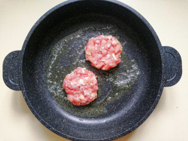 Смазанными маслом ладонями сформируйте из фарша 2 крупные круглые котлеты.