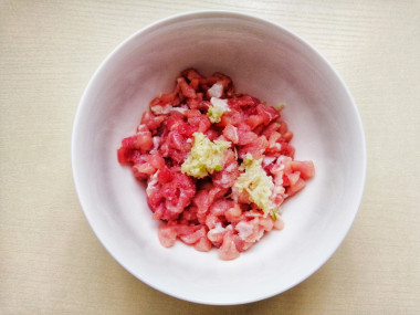 Добавьте в мясо чеснок, соль и специи. Хорошо вымесите фарш руками. Можно отбить мясо об стол.