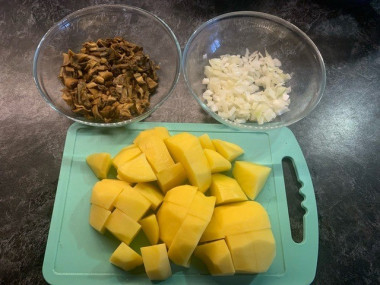 Сушеные грибы залить кипятком и оставить на час (или залить холодной водой и оставить на ночь).