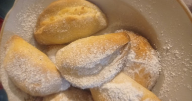 Выпекаем сочни в духовке, разогретой до 200°С, 25-30 минут. Через 15 минут температуру снижаем до 180°С. Готовые сочни с творогом посыпаем сахарной пудрой. Приятного аппетита!
