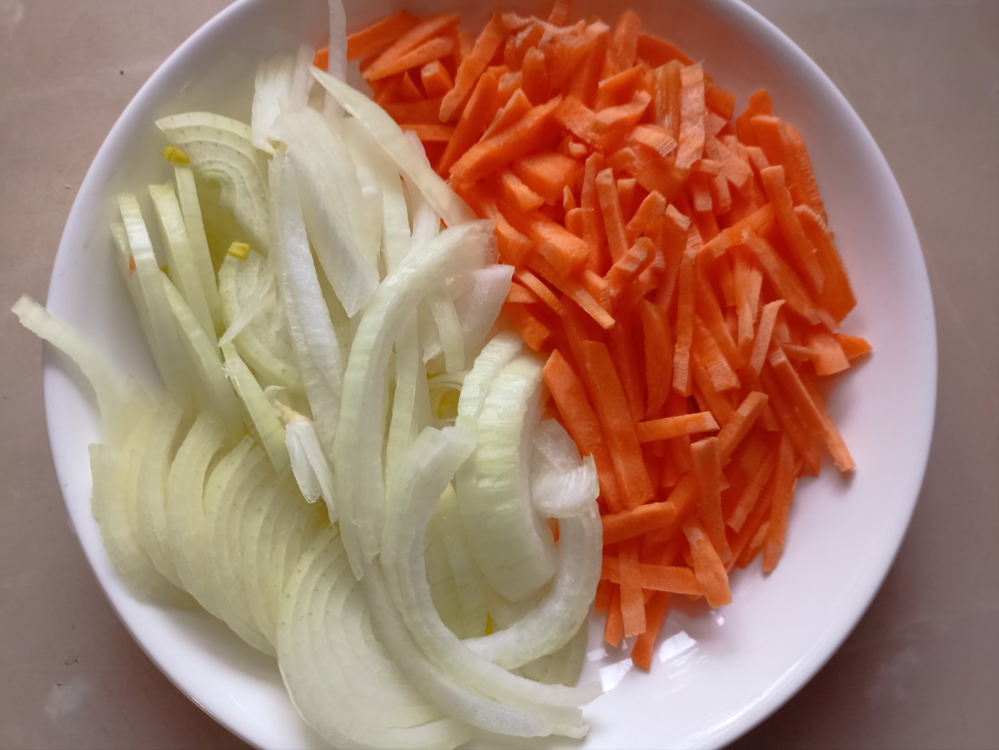 Лук нашинкуйте тонкими кольцами или полукольцами. Морковку нарежьте полосками или натрите на крупной тёрке.Шаг 6: