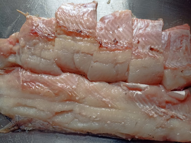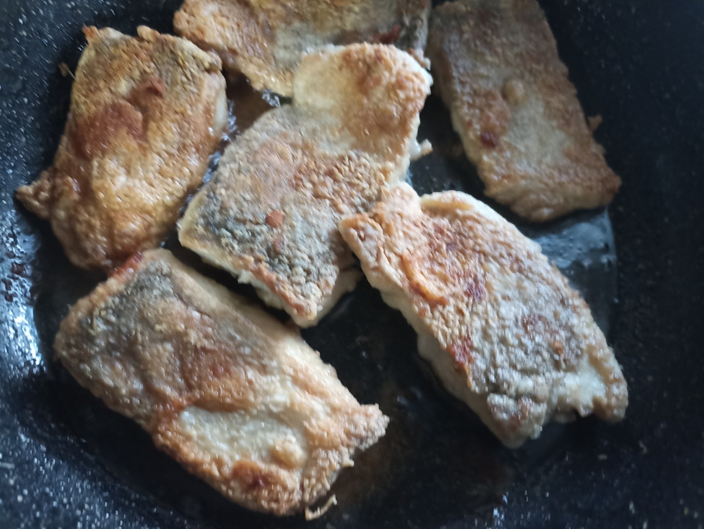 Каждый кусочек рыбы слегка посолите и обваляйте в муке со всех сторон.Шаг 4: