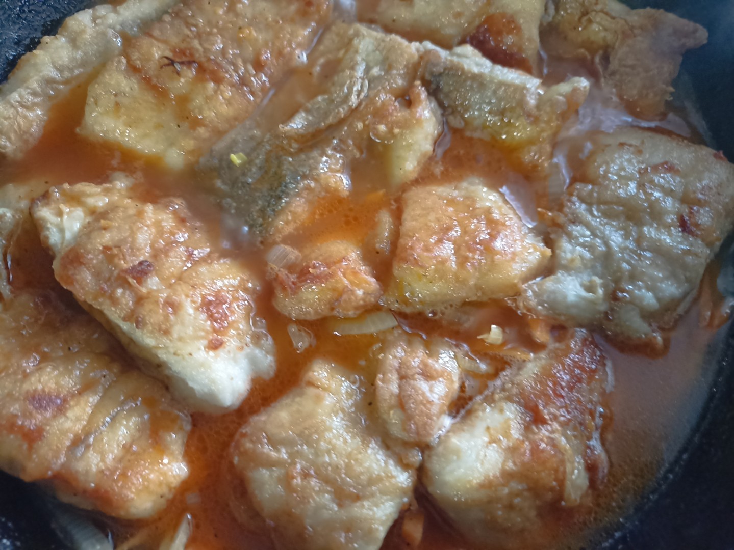 Через пять минут каждый кусочек переверните, чтобы рыба напиталась всеми ароматами томатного соуса. Досолите по необходимости.Шаг 11: